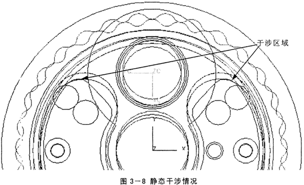 后三種都是實際結構可能存在的,當出現(xiàn)第一種干涉即硬干涉時就要引起高度重視,這可能是:設計存在問題,必須及時糾正。就是借助此功能,造型完成后,本人發(fā)現(xiàn)輸出盤與擺紅、輪間有硬干涉(見圖3-8),與設計此減速器的部門交換意見,原來他們在設計完后沒有發(fā)現(xiàn)此問題,等制造出成品后才發(fā)現(xiàn),便通過手工磨削將干涉部分除去。此處也充分體現(xiàn)了與傳統(tǒng)的設計方法相比,虛擬樣機技術有著不可比擬的優(yōu)越,即在制造第一臺物理樣機前就發(fā)現(xiàn)了機構在結構方面的缺陷。至于機構的優(yōu)化和性能改進方面,通過后面的仿真分析更能清楚地展現(xiàn)虛擬樣機技術的優(yōu)越。
