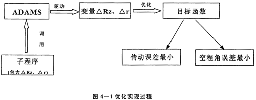 上已述及,擺線輪修形方式及修形量的選擇對(duì)RV減速器傳動(dòng)誤差及空程角誤差的影響很大,因此進(jìn)行優(yōu)化分析應(yīng)將傳動(dòng)誤差及空程角誤差作為目標(biāo)函數(shù),而將移距修形量△Rz及等距修形量△r作為設(shè)計(jì)變量,且△Rz與△r的正、負(fù)號(hào)表明了修形方式,子程序又是建立擺線輪的通用齒廓方程,通過(guò)ADAMS對(duì)子程序的調(diào)用,就可得到最優(yōu)的修形組合。具體的實(shí)現(xiàn)過(guò)程如下圖所示: