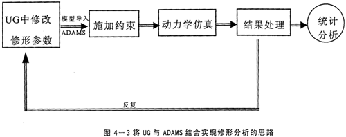 前面已經(jīng)以擺線傳輸線的參數(shù)化建模為例,闡述了UG的強(qiáng)大的基于特征的參數(shù)化造型功能,既然用子程序的方式實(shí)現(xiàn)不了,將UG的該功能加以充分利用,也可以實(shí)現(xiàn)優(yōu)化修形的目的。實(shí)現(xiàn)的途徑是在建造擺線輪的表達(dá)式中考慮修形量△Rz與△r,這樣就建造了修形后的擺線輪,同時(shí)△Rz與△r是隨機(jī)可調(diào)的變量,可以得到任意組合的修形方式。并且UG的數(shù)據(jù)存儲(chǔ)具有單一數(shù)據(jù)庫(kù)的特點(diǎn),零件圖中修改后,裝配圖及工程圖全都自動(dòng)更新,不用人工去費(fèi)時(shí)修改。然后,再將總裝配模型導(dǎo)入到ADAMS中施加約束。執(zhí)行仿真。這樣就得到多組修形組合的仿真結(jié)果,經(jīng)過(guò)統(tǒng)計(jì)分析就可得到最佳的修形組合。具體思路如下圖所示。