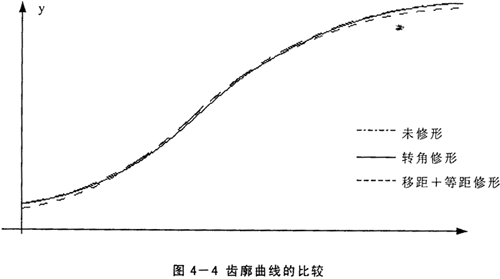 采用這種方法加工擺線輪時(shí),磨齒機(jī)的調(diào)整和加工標(biāo)準(zhǔn)齒廓時(shí)相同,只是在磨出標(biāo)準(zhǔn)齒廓以后,將分齒機(jī)構(gòu)和偏心機(jī)構(gòu)的聯(lián)系脫開,然后撥動(dòng)分齒掛輪上的齒輪,使工作臺(tái)轉(zhuǎn)過(guò)一微小的角度δ,從而改變了擺線輪在上一次磨削時(shí)的初始位置。這樣重新磨削后,就得到一條與標(biāo)準(zhǔn)齒廓基本上一樣的齒廓,僅整個(gè)輪齒變瘦一些,而齒間變大一些;其特點(diǎn)是同時(shí)嚙合齒數(shù)較多,但擺線輪的齒頂和齒根圓直徑?jīng)]有變化,該處與針齒相嚙合時(shí)沒有間隙存在,因此不能單獨(dú)使用轉(zhuǎn)角修形法。