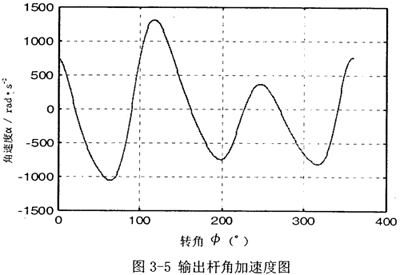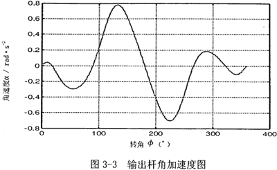首先由圖3-2可以看到,若機構(gòu)結(jié)構(gòu)參數(shù)設(shè)計恰當(dāng),并且調(diào)整中間滑塊3偏移到合適的位置時,可在一定范圍內(nèi),產(chǎn)生一個反向的速度波適度抵消原速度波動。再由圖3-3可知,在未加入第二自由度時,加速度變化值不大,說明阻力矩和電機主動力矩不會受到大的影響,不致導(dǎo)致原機械系統(tǒng)的各項參數(shù)發(fā)生大的變化。