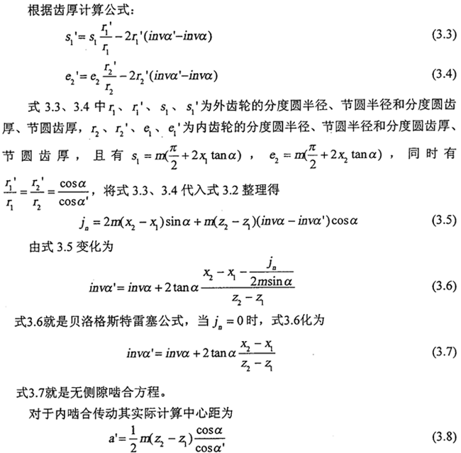 當齒輪傳動的幾何設計參數(shù)確定后,影響實際傳動的就只有制造和安裝誤差,對于中心距a′而言,影響它的因素是制造誤差、安裝誤差,而不是齒側間隙jn與齒輪變位系數(shù)X2-X1。齒輪設計是按無側隙進行的,同時不考慮制造、安裝誤差,但加工時,齒輪齒厚公差都是負偏差,即齒輪厚公差都是負偏差,即齒輪必須減薄,這樣實際傳動存在齒側隙。如果不考慮中心距的誤差,由式3.6的第3種形式可知,齒側隙的變化必然影響到齒輪變位系數(shù)的變化。顯然,這樣的變化也就會使齒輪的齒頂圓產生變化,相應的齒頂圓奢力角產生變化,進而影響齒輪嚙合重合度。