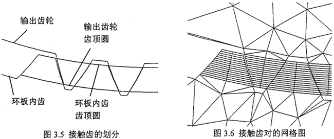 因為在少齒差內嚙合中,不處于嚙合位置的齒對在進入嚙合之前以及在脫離嚙合之后,其內、外齒廓間的間隙非常小,因此雙環(huán)減速器環(huán)板內齒輪嚙合傳動在載荷作用下,因彈性變形實際接觸齒對數(shù)遠大于理論重合度,在傳遞載荷的過程中,輪齒的變形量要大于一部分齒對的間隙,這些齒對就要接觸并同時分擔載荷,這就大大提高了整個齒輪傳動裝置的承載能力。同時實際齒輪的接觸對數(shù)及接觸應力,隨著載荷增大而相應增加。因而少齒差內嚙合行星齒輪傳動的實際接觸齒對數(shù)的確定,對齒輪承載能力的估算以及齒輪模數(shù)的正確確定具有重要意義。對于齒輪的接觸問題的,國內外學者對此已作了不少研究,取得一些研究成果。然而這些研究有的沒有考慮誤差的影響,有的僅考慮內外嚙合齒輪副齒廓理論間隙,沒有考慮輪齒制造誤差和輪齒的彈性變形的影響。本文對于環(huán)板內齒輪接觸問題進行了計算,計算時考慮內外嚙合齒輪副齒廓理論間隙、制造誤差及輪齒彈性變形的影響,在此基礎上,建立了少齒差內嚙合行星齒輪傳動實際接觸齒對數(shù)及各齒間載荷分配的理論分析計算的實體模型,利用I-DEAS軟件進行了環(huán)板內齒輪接觸有限元計算,并用該軟件分析計算了在不同載荷工況下的實際接觸齒對數(shù)、最大接觸應力以及兩環(huán)板上各接觸齒的載荷分配情況。