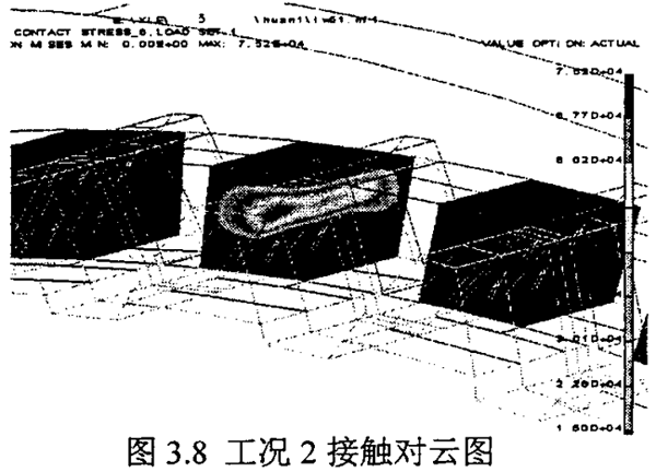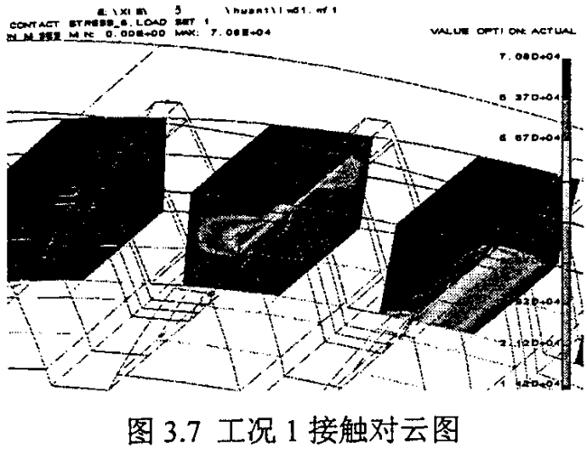 工況六至工況十這四和情況,是指兩環(huán)板之間不對稱,即偏心軸的兩個偏心拐的尺寸誤差不一致,這里考慮的是特殊狀況,從表3.10-3.13看出,當兩環(huán)板不對稱時,將產生嚴重的載荷不均現(xiàn)象,載荷偏向中心距小的環(huán)板內齒上,甚至只有一個環(huán)板承受載荷。由此說明,對于雙環(huán)減速器偏心軸有加工,應特別注意兩曲捌的制造誤差,應盡量使安裝好的兩環(huán)板具有較好的對稱性。圖3.7~圖3.12為六種工況下環(huán)板內齒的接觸齒對的應力云圖。