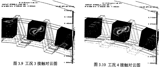 由表3.2~3.13可以看出,無論有無制造、安裝誤差的影響,隨著負荷的增加,齒輪實際嚙合接觸對數(shù)增加,但從計算結果分析證明,負荷對接觸對的影響小于誤差對接觸對的影響。對比表中的接觸對數(shù)和接觸應力,數(shù)據(jù)表明當齒厚發(fā)生變化時,實際接觸齒對數(shù)變化比較大,同時最大接觸應力也有明顯變化。從變化的趨勢上看出與前面的理論推導變化趨勢相同,這里只是更加明顯。