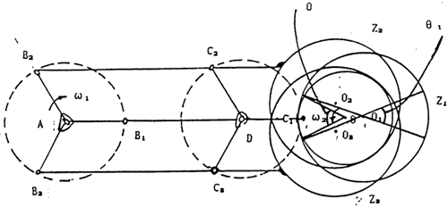 如圖7-1示,三環(huán)減速器三套平面四桿機(jī)構(gòu)AB1C1D-01、AB2C2D2-02、AB3C3O3及外齒輪見圖中所示。在圖示位置時(shí),平面四桿機(jī)構(gòu)AB1C1D處理死點(diǎn)位置,運(yùn)動(dòng)處于不確定運(yùn)動(dòng)狀態(tài),由于嚙合力的作用將產(chǎn)和瞬間的沖擊力。為了能除去或減少該沖擊力的作用,我們?cè)谝欢ǖ慕嵌圈葍?nèi)對(duì)AB1C1D上的內(nèi)齒輪進(jìn)行修形,使在死點(diǎn)位置時(shí),平面四桿機(jī)構(gòu)AB1C1D不受嚙合力或少受嚙合力作用,這樣,通過(guò)其余兩套平面四桿機(jī)構(gòu)就能較易將其速成過(guò)死點(diǎn)位置,從而達(dá)到減不止或消除過(guò)死點(diǎn)的沖擊。同樣,對(duì)另兩套平面四桿機(jī)構(gòu)AB2C2D2及AB3C3O3作同樣的修形。這種方法我們已正在試驗(yàn)過(guò)程中。