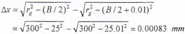 位移傳感器根據(jù)運動的型式不同分為直線位移傳感器和角度位移傳感器,直線位移傳感器常見的有光柵位移傳感器、感應(yīng)同步傳感器等,它們可以直接安裝在所測直線運動部件上,無傳動誤差影響,精度高。但是由于結(jié)構(gòu)的原因,它們需要非常精確的安裝基準(zhǔn)和合適的安裝空間,且通常情況下安裝定位較困難。由于光柵的密封性較差,光柵材料較脆弱,所以它們的抗污染性能和抗振性能也較差,而且所需防護裝置也較復(fù)雜,成本較高。角度位移傳感器最常用的有光電編碼器,它具有精度高,體積小,安裝方便、密封性好、抗污染和抗振性能好等優(yōu)點。本設(shè)計需測刀架的位移,在刀架上,切削冷卻潤滑油、切屑及粉塵的飛濺較嚴(yán)重,且不易設(shè)置防護裝置。如果采用光電編碼器需通過檢測絲桿的角位移間接檢測刀架的直線位移,但絲桿及傳動機構(gòu)具有的傳動精度和位移檢測精度是足夠的。另外,加工鼓形齒輪時,形成鼓度曲線的實際切削位置通常在曲線較陡的范圍,例如加工圓弧鼓度曲線,幾何關(guān)系見圖6-3,設(shè)位移圓半徑rg=300mm,齒寬B=50mm,當(dāng)Δy=0.01mm,則