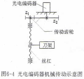 由于機床的刀架進給絲桿的位置及結(jié)構(gòu)關(guān)系,通常不能將光電編碼器直接聯(lián)接在刀架進給絲桿的端頭,需將絲桿的旋轉(zhuǎn)運動通過一對齒輪傳至光電編碼器。機械傳動示意圖如圖6-4所示。