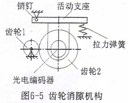 普通滾齒機具有刀架進給絲桿的消隙機構(gòu),因此絲桿正反轉(zhuǎn)無間隙。齒輪的安裝有側(cè)隙存在,為了消除側(cè)隙對位移檢測影響,采用彈簧消隙機構(gòu),機構(gòu)簡圖如圖6-5所示。光電編碼器安裝在活動座上,其軸上裝有齒輪2,齒輪1與刀架進給絲桿固連,活動支座在彈簧作用下繞銷釘轉(zhuǎn)動,壓迫齒輪2與齒輪1使其無側(cè)隙。由于光電編碼器的驅(qū)動力矩非常小,因此所需的彈簧的拉力也很小,不會對光電編碼的正常工作造成不良影響。