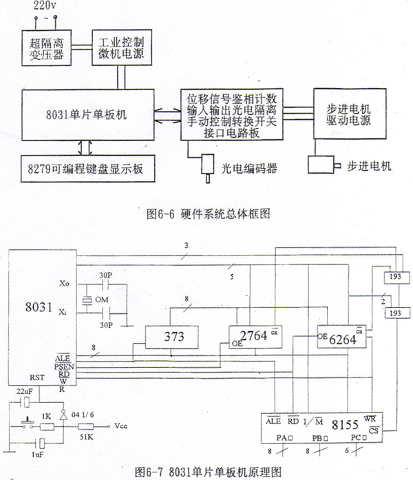 數(shù)控硬件由8031、外擴一片程序存貯器芯片2764、外擴一片數(shù)據(jù)存貯器6264和外擴一片通用可編程并行輸入/輸出接口芯片8155、總線、片選擇碼電路、采用8279芯片的通用鍵盤顯示電路和位移鑒相輸入及驅(qū)動輸出的接口電路組成。數(shù)控系統(tǒng)的現(xiàn)場抗干擾性能直接關(guān)系到整個系統(tǒng)的成敗。在硬件方面,為了防止強電電網(wǎng)的電壓尖峰和毛刺對系統(tǒng)的干擾,采用抗干擾能力強的工業(yè)用微機電源、超隔離變壓器、片選法譯碼電路、光電隔離電路。