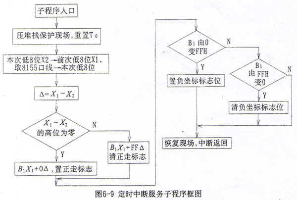 位移脈沖計數(shù)的高8位的處理采用差值法,設(shè)前后兩次的低8位二進制數(shù)為X1、X2,高8位二進制數(shù)為B1、B2,先求差值△=X2-X1,若△的最高位為1,則此時整個16位計數(shù)的十六進制數(shù)為B1X1+FF△;若△的最高位為0,則為B1X1+0△。相應(yīng)的,若△的最高位為1時,當(dāng)前刀架向Y坐標(biāo)負(fù)方向運動;若△的最高位為0時,當(dāng)前刀架向Y坐標(biāo)正方向運動。而高8位由FFH變?yōu)?0H時,當(dāng)前刀架位置在Y坐標(biāo)大于零;高8位由00H變?yōu)镕FH時,當(dāng)前刀架位置在Y坐標(biāo)小于零,此時應(yīng)取Y坐標(biāo)補碼進行插補運算。定時中斷服務(wù)子程序框圖見圖6-9。
