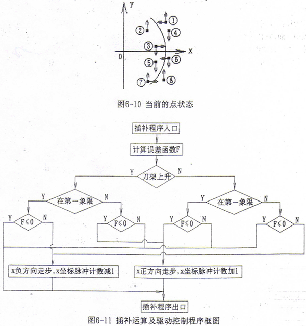 非圓弧曲線插補運算時,首先根據(jù)當(dāng)前的Y坐標(biāo)值及插補曲線f(x,y)=0,求解出x坐標(biāo)理論值xt,設(shè)當(dāng)前的實際x坐標(biāo)為xr,令誤差函數(shù)F=xr-xt。對圓弧曲線,根據(jù)當(dāng)前的x、y坐標(biāo),計算x2+y2值,令誤差函數(shù)F=x2+y2-R2。根據(jù)當(dāng)前點在不同象限、當(dāng)前刀架的運動方向及誤差函數(shù)的正負(fù),共有8種情況出現(xiàn)(如圖6-10所示),應(yīng)根據(jù)它們的狀態(tài)進行不同的處理。①、⑥兩種情況應(yīng)使當(dāng)前點向x坐標(biāo)負(fù)方向走步;③、⑦兩種情況應(yīng)使當(dāng)前點向x坐標(biāo)正方向走步;②、④、⑤、⑧四種情況無需在x坐標(biāo)方向走步。由于在切齒過程中刀架的進給速度較低,最高一般不超過30毫米/分鐘,兩次y坐標(biāo)計數(shù)脈沖間隔時間可達幾十毫秒,而插補運算的時間不超過1毫秒,因此插補速度足夠。在刀架快速運動時,插補有滯后,但此時不切削,這種滯后不影響加工。在插補過程中,顯示器輪流顯示當(dāng)前的x、y坐標(biāo)值,以利于操作者監(jiān)視加工情況,因此還需進行顯示BCD碼的轉(zhuǎn)換和輪換的控制。插補運算及驅(qū)動控制程序框圖見圖6-11。