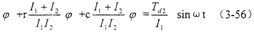 現(xiàn)單獨(dú)考慮擾動(dòng)轉(zhuǎn)矩產(chǎn)生的相對(duì)轉(zhuǎn)角φ2,目前國(guó)內(nèi)建立了圖3.13所示力學(xué)模型[2],出于橡膠件相對(duì)于兩側(cè)的鐵圈剛性很小,現(xiàn)假設(shè):(1)只有聯(lián)軸器兩側(cè)的鐵圈具有剛性,只有橡膠具有彈性和阻尼;(2)聯(lián)軸器主動(dòng)側(cè)作用有按簡(jiǎn)諧規(guī)律變化的擾動(dòng)轉(zhuǎn)矩分量Tdlsinωt此時(shí)按照動(dòng)量矩定理,按聯(lián)軸器兩側(cè)力矩平衡條件,可以分別列出兩個(gè)圓盤(pán)的轉(zhuǎn)動(dòng)運(yùn)動(dòng)方程式,即系統(tǒng)振動(dòng)的微分方程是: