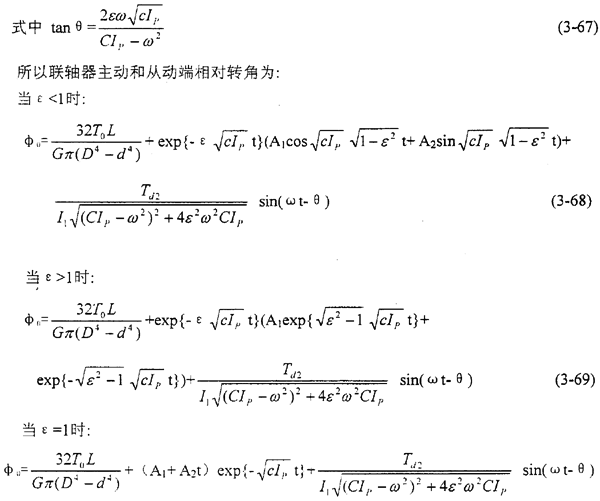 比較式(3-74),(3-75),(3-76)可知,由于 ,所以當(dāng)阻尼系數(shù)等于臨界阻尼系數(shù)時(shí),產(chǎn)生的剪切應(yīng)力最小,此時(shí) 。由于對(duì)于一定的材料制作的聯(lián)軸器,因?yàn)椴牧系淖枘崽匦允且欢ǖ模虼嗽谝院舐?lián)軸器的設(shè)計(jì)過(guò)程中,可以通過(guò)控制兩端的轉(zhuǎn)動(dòng)慣量,或者通過(guò)改變聯(lián)軸器本身的尺寸來(lái)控制它的扭轉(zhuǎn)剛度,力求使 的值盡可能的接近阻尼系數(shù),從而減少產(chǎn)生的剪切力,提高聯(lián)軸器的工作狀態(tài)和延長(zhǎng)聯(lián)軸器的使用壽命。