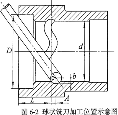 由于球狀銑刀的刀刃部分為半球頭形狀,為避免球頭銑刀的刀柄與殼體內(nèi)壁發(fā)生干涉,導致內(nèi)空間正弦滾道被銑削出平面,則空間正弦曲線的平衡位置到殼體端面的距離L應滿足一定的條件,由圖6-2中各參數(shù)的關系,可以得到