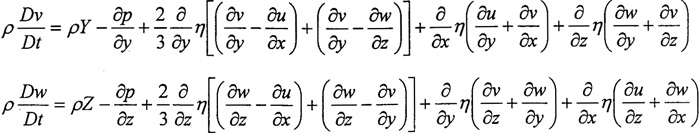式中u,v,w——分別為沿坐標(biāo)x, y,z方向的流速;X,Y,Z——體積力分量;p——密度;η——粘度;t——時(shí)間。