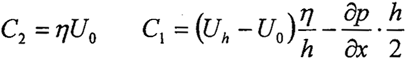 用邊界條件確定C1和C2。由于界面上流體速度等于界面速度,如果兩固體表面的速度為U0和Uh,即當(dāng)z=0時(shí),u=U0;當(dāng)z=h,u=Uh。求得