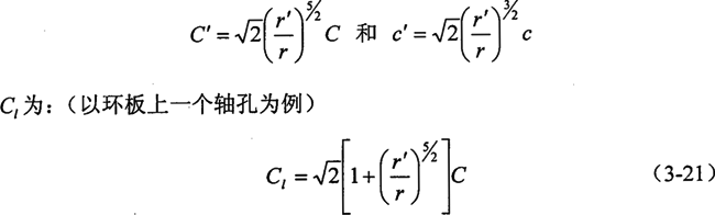 上式是按滑動(dòng)軸承理論進(jìn)行的,與我們?cè)O(shè)計(jì)的油膜浮動(dòng)裝置有重要區(qū)別。我們?cè)O(shè)計(jì)的油膜浮動(dòng)均載方案,共有兩層油膜,即:偏心套與浮環(huán)、浮環(huán)與滾動(dòng)軸承之間各形成一層共轉(zhuǎn)滑動(dòng)軸承油膜,設(shè)浮環(huán)內(nèi)外半徑為r、r′,c、c′為浮環(huán)的內(nèi)外半徑間隙,C1為環(huán)板的浮動(dòng)量,由摩擦學(xué)理論可導(dǎo)出共轉(zhuǎn)軸承的浮動(dòng)量C′和半徑間隙c′與普通滑動(dòng)軸承的浮動(dòng)量C和半徑間隙c之間的關(guān)系下:
