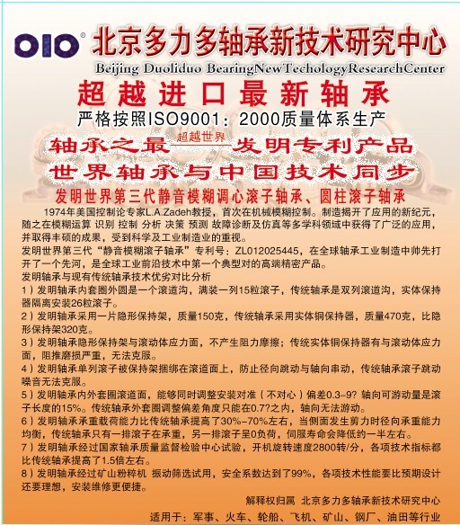 高端軸承新技術(shù)專利簡介    高端軸承新技術(shù)發(fā)明專利簡介:本廠發(fā)明了高端滾動(dòng)調(diào)心滾子軸承(三類), 高端園柱滾子(二類),在承重方面保持了傳統(tǒng)軸承的各種優(yōu)點(diǎn),承截能力加強(qiáng)了,不同之處在于它沒有傳統(tǒng)的保持架,同時(shí)沒有了