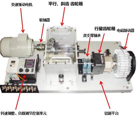 基本特征 齒輪傳動(dòng)系統(tǒng)模擬實(shí)驗(yàn)臺(tái)(PT500)是專為模擬工業(yè)齒輪故障而設(shè)計(jì)的,用于齒輪傳動(dòng)系統(tǒng)的深入研究,它由一個(gè)帶有滾動(dòng)軸承、行星齒輪箱和電磁制動(dòng)器和兩級(jí)平行軸齒輪箱所組成。PT500的所有功能可用于研究齒輪箱動(dòng)力學(xué)和聲學(xué)特性、機(jī)器狀態(tài)監(jiān)測(cè)、基于振動(dòng)的診斷技術(shù)、潤(rùn)滑或磨損顆粒分析。它有一個(gè)堅(jiān)固穩(wěn)定的結(jié)構(gòu),有足夠的空間來放置振動(dòng)數(shù)據(jù)采集器,來采集振動(dòng)信號(hào)。其結(jié)構(gòu)便于安裝,更換齒輪。2級(jí)平行軸齒輪箱可設(shè)計(jì)為----通過不同的齒輪模塊降低或提高齒輪比。并且可以測(cè)試滾動(dòng)軸承缺陷,例如內(nèi)圈,外圈和滾珠損壞。在齒輪測(cè)試中可以進(jìn)行基本的負(fù)載控制,并且可以進(jìn)行間隙調(diào)整以進(jìn)行間隙研究。可以將不同類型的缺陷集成到齒輪箱中,通過各種缺陷一次一個(gè)地或同時(shí)地研究缺陷之間的相互作用。